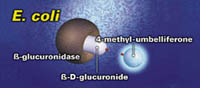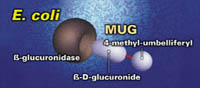大肠杆菌使用 β-葡糖醛酸酶分解代谢 MUG 时,能够发出荧光。 因为绝大多数的非大肠菌群杂菌不产生这些酶,所以杂菌不能生长和产生干扰。